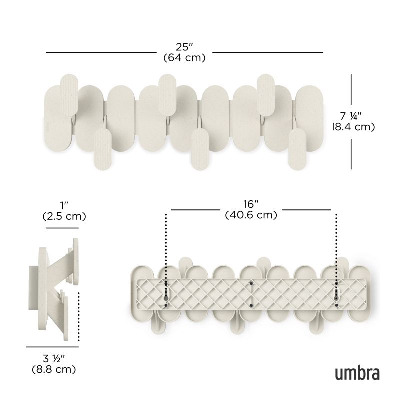 Tempo 6 Hook brings modern style and everyday function together in one sleek wall-mounted design. Its six staggered hooks maximize hanging space while creating a striking, graphic look on your wall. Made from durable, lightweight recycled plastic blended with recycled wood fiber, Tempo adds a subtle natural texture that complements a variety of spaces; from entryways and bedrooms to bathrooms and offices. Each hook holds up to 5 lbs (30 lbs total), making it perfect for coats, bags, towels, and more. Measures 18.6 x 6.22 x 2.54" (47 x 15.7 x 6.4 cm).