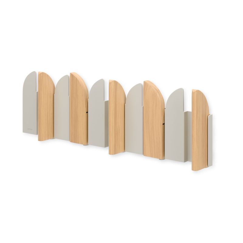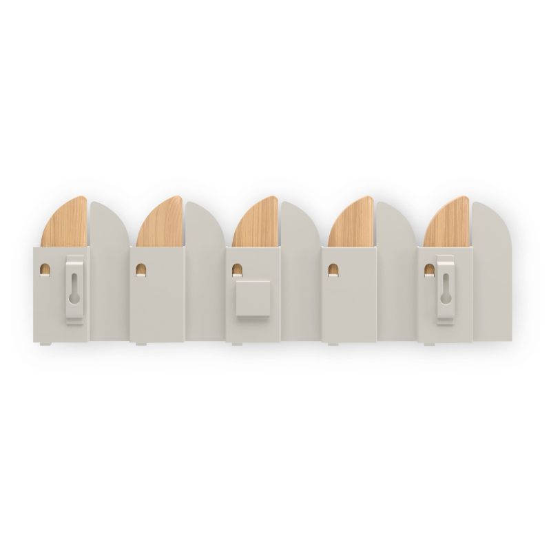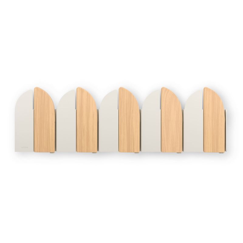 Elevate your walls with the Umbra Saloon Wall Hook - a functional statement piece inspired by classic swinging saloon doors. Crafted from a mix of warm wood and smooth metal, Saloon blends playful design with everyday practicality. Its five flip-open hooks, each holding up to 5 lbs, offer a tidy place for coats, bags, scarves, or accessories, then close them up for a clean, streamlined look. Perfect for entryways, bedrooms, or offices, Saloon doubles as wall art when not in use. Easy to install with all hardware included, its alternating wood-and-metal panels create a dynamic, eye-catching pattern that brings both style and utility to your space. Measures 18 x 5.83 x 1.77" (2 x 43 x 14 cm).