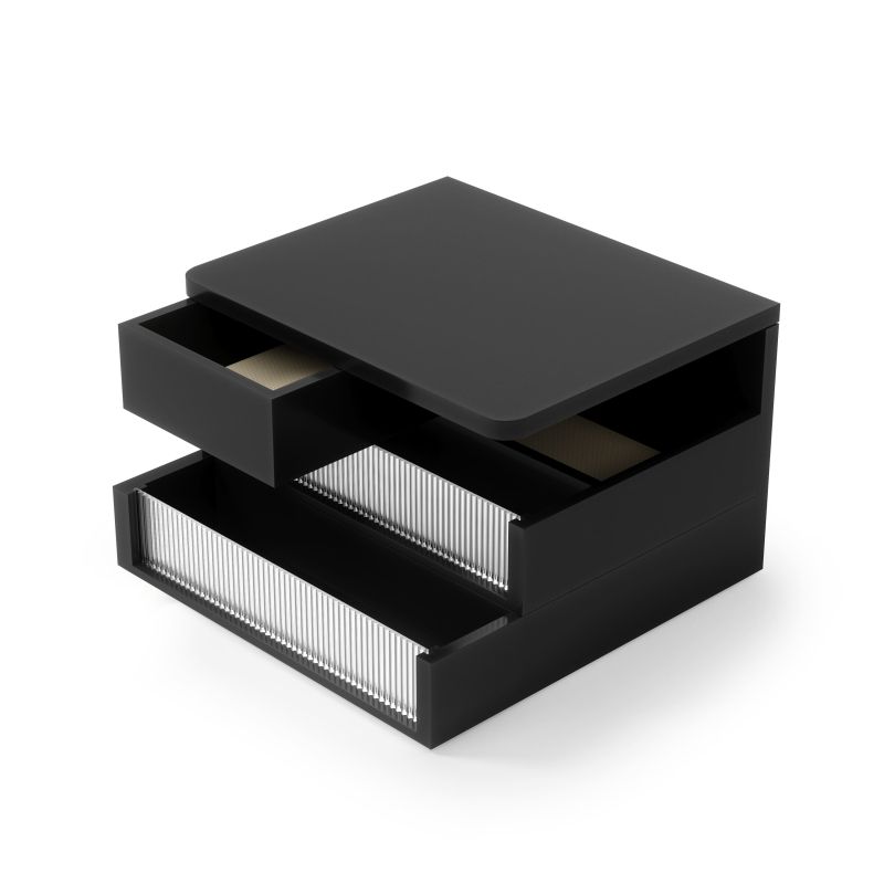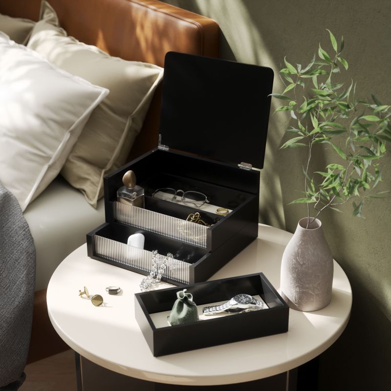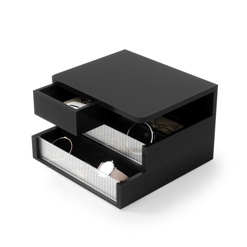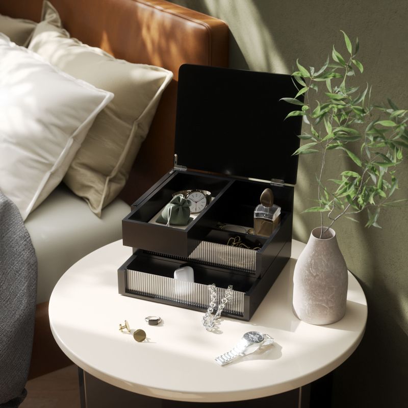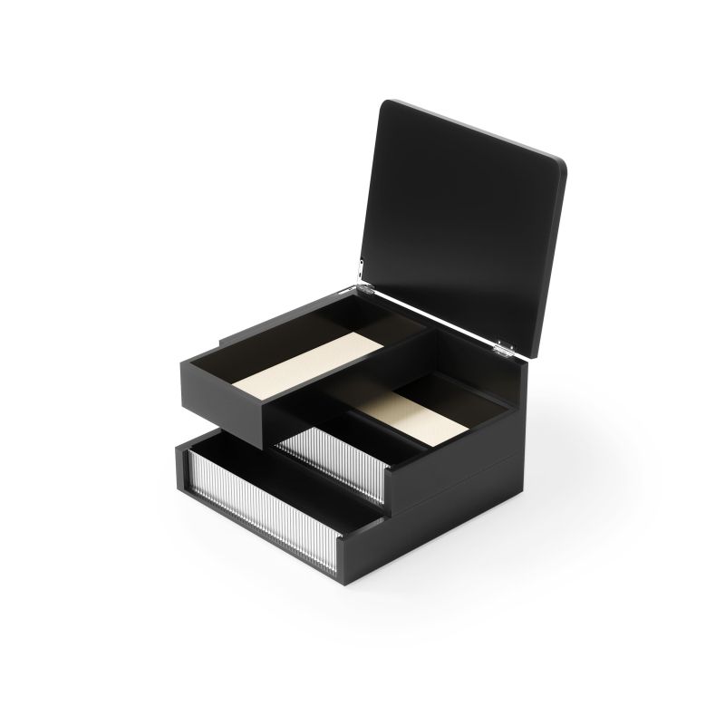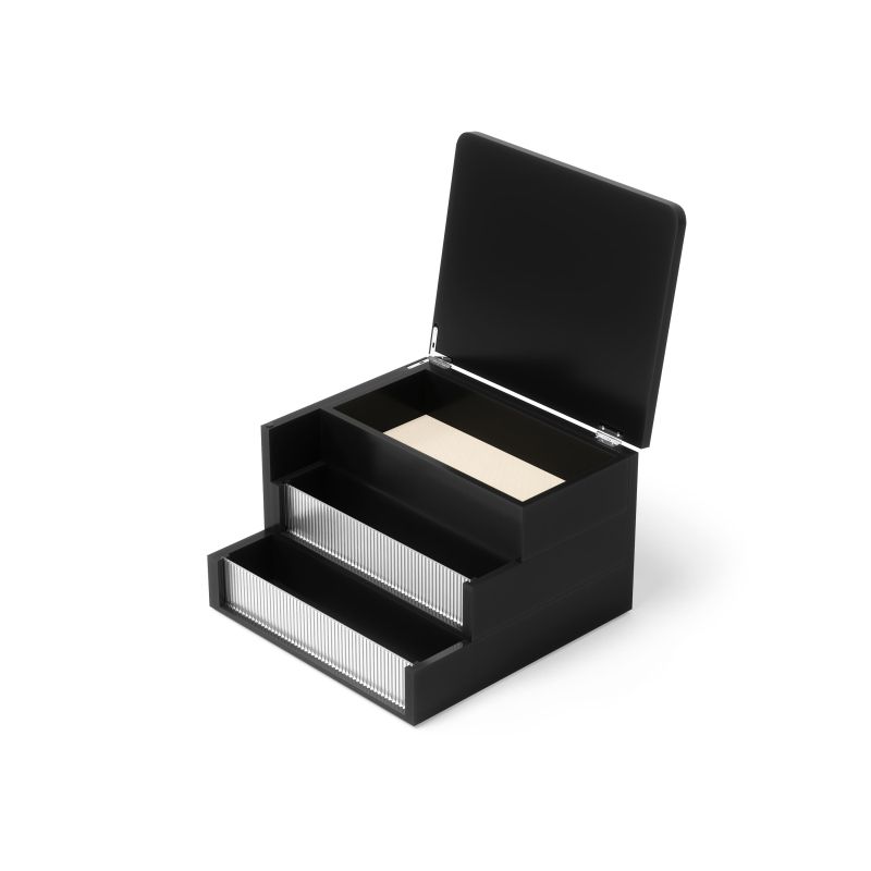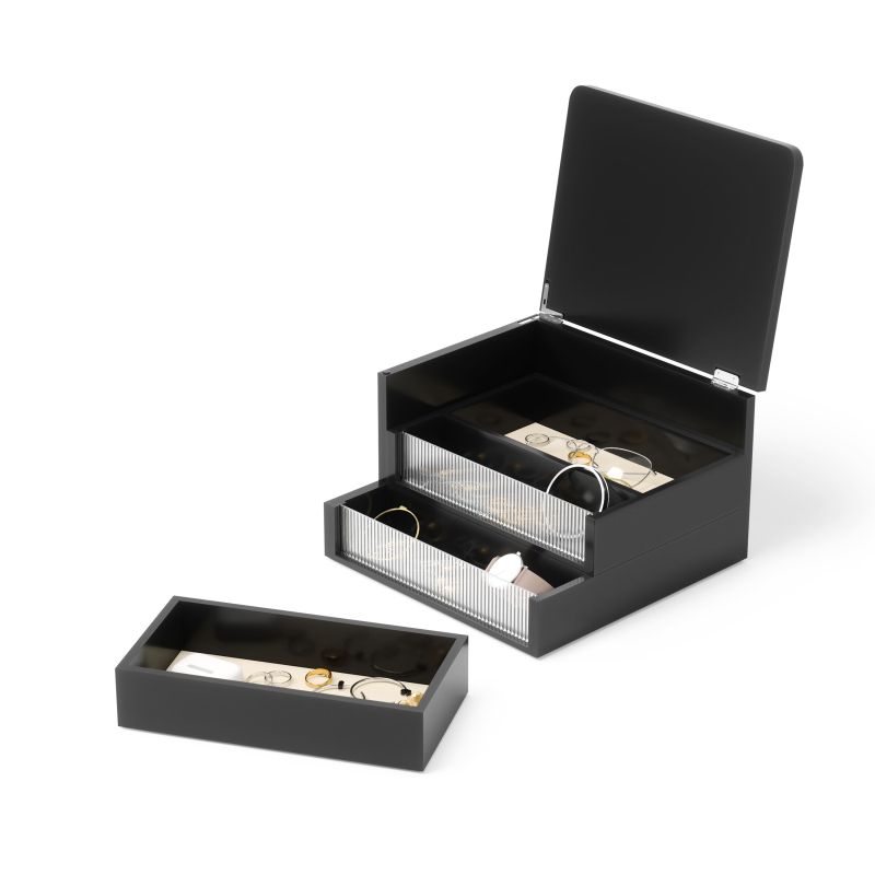 The Malibu Storage Box is a thoughtfully designed solution for keeping your favorite pieces organized, protected, and close at hand. With three tiers of storage, it offers plenty of room to neatly tuck away jewelry and accessories, while a soft linen lining prevents scratches and tangles. Fluted glass accents and a modern silhouette bring a touch of elegance to any dresser, nightstand, or vanity. Complete with non-slip rubber feet, Malibu stays securely in place while protecting your surfaces, a refined blend of style and function. Measures 9.5 x 9 x 5.87" (24 x 23 x 15 cm).