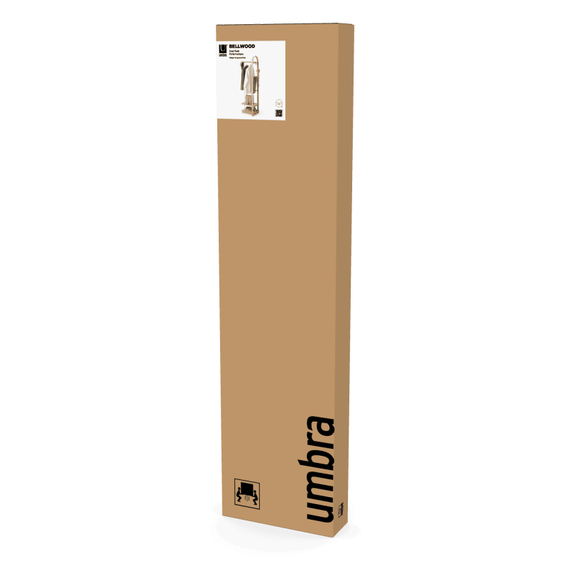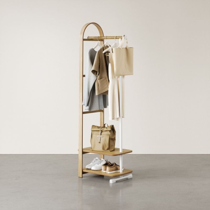 Характерният за Umbra силует с елегантно извито дърво е съчетан с интелигентно разпределение на елементите, което позволява дрехи, чанти и аксесоари да бъдат подредени удобно и достъпно. Горната релса осигурява достатъчно място за окачване на палта и връхни дрехи, а долният рафт добавя функционално пространство за чанти, обувки и други принадлежности – както върху него, така и под него.