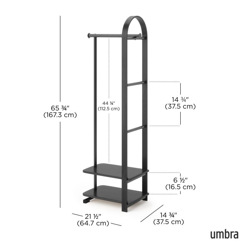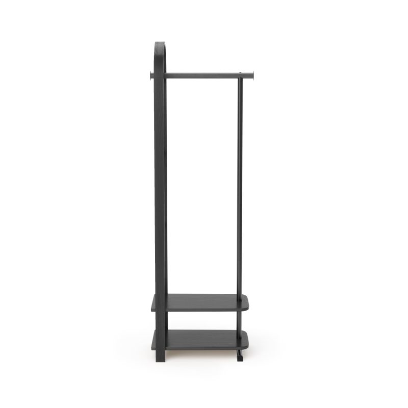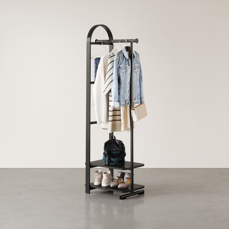 Характерният за Umbra силует с елегантно извито дърво е съчетан с интелигентно разпределение на елементите, което позволява дрехи, чанти и аксесоари да бъдат подредени удобно и достъпно. Горната релса осигурява достатъчно място за окачване на палта и връхни дрехи, а долният рафт добавя функционално пространство за чанти, обувки и други принадлежности – както върху него, така и под него.