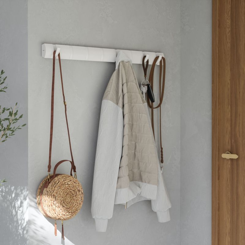 Стенната релса Flip предлага интелигентно решение за съхранение, съчетаващо компактност и гъвкавост. Моделът разполага с прибиращи се куки, подходящи за окачване на палта, шалове, чанти, чадъри, кърпи и други ежедневни аксесоари. За разлика от обемните стоящи закачалки, Flip се монтира директно на стената и спестява ценна площ, което я прави отличен избор за малки жилища, антрета и коридори.