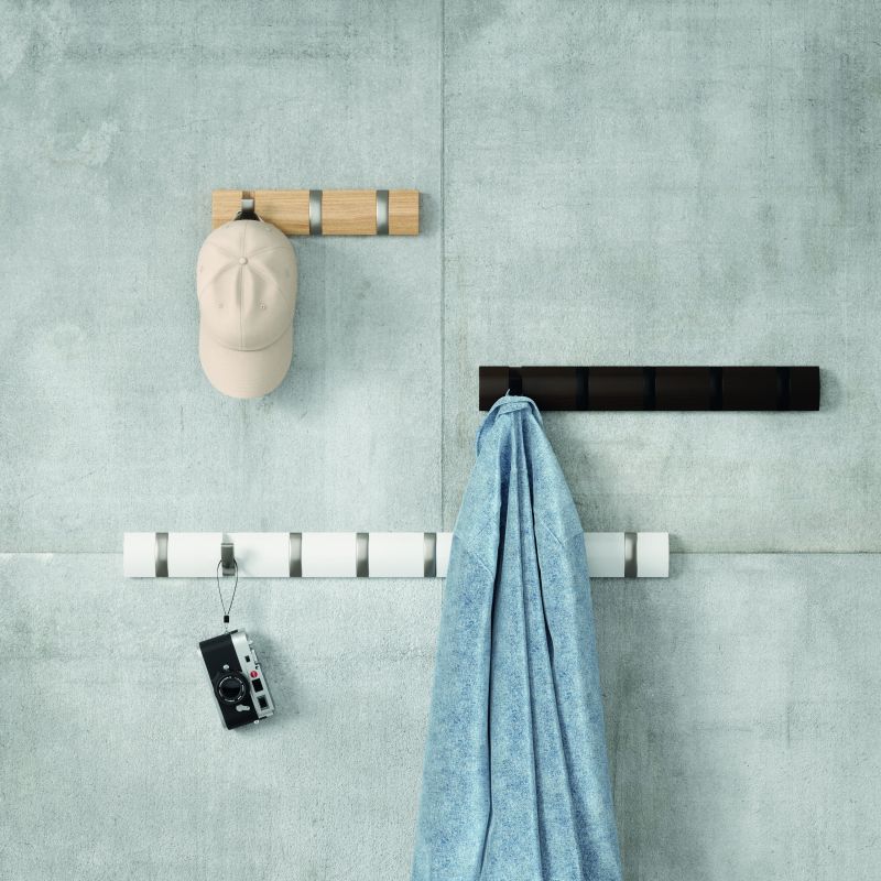 Когато куките не са използвани, те се прибират и оформят изчистена, минималистична линия. Предлага се в разнообразие от цветове, лесно съчетаващи се с различни интериорни стилове, а универсалният дизайн позволява монтаж в коридор, спалня, баня или офис. Всички варианти на Flip са изработени от качествена масивна дървесина, осигуряваща здравина и дълготрайност.